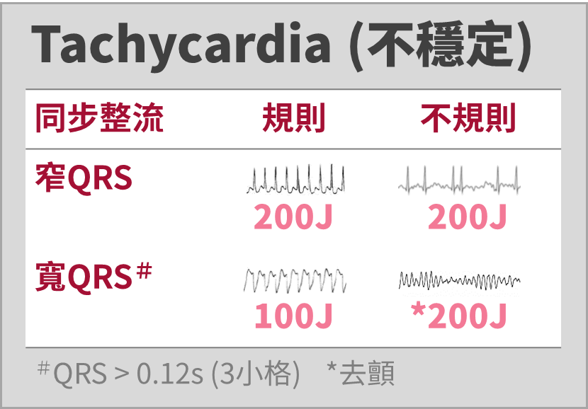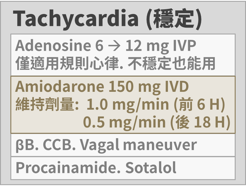 • 不穩定:同步整流(100 J),或 Amiodarone 150mg IVD