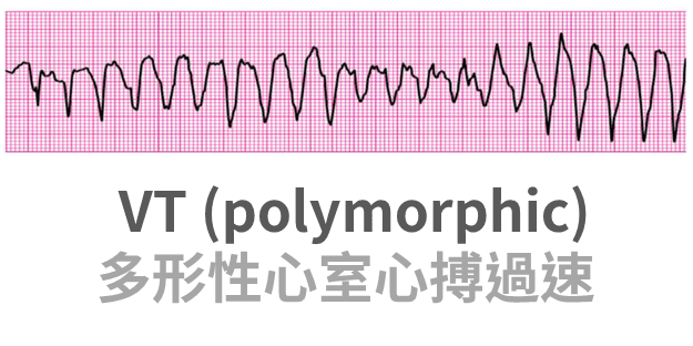 • 多形 VT 特徵:大而快的 QRS 波、不規則