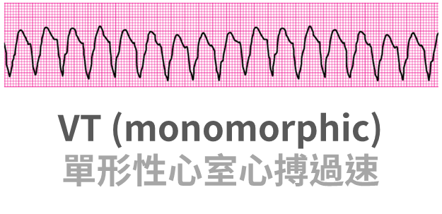• 單形 VT 特徵:大而快的 QRS 波、規則