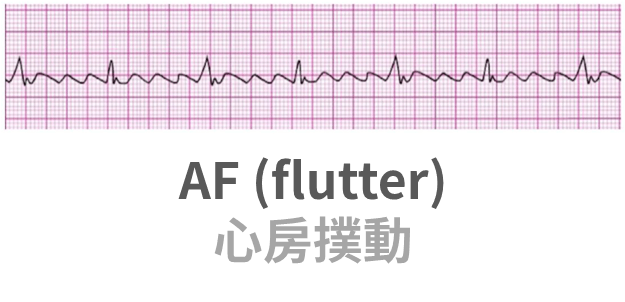 • AF 心房撲動特徵:鋸齒狀 P 波。可能規則或不規則。P 波往往比 QRS 多