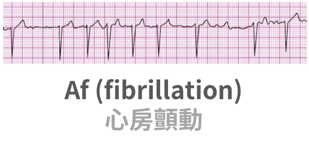 • Af 心房顫動特徵:找不到 P 波(心房無效收縮)