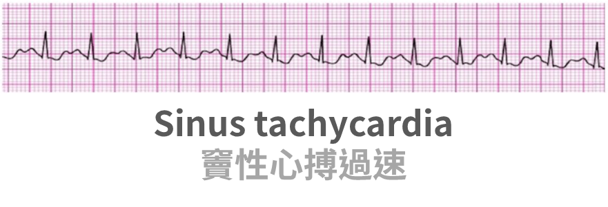• Sinus tachycardia 特徵:規律的 P 之後跟著 QRS,且 PR < 0.2 秒