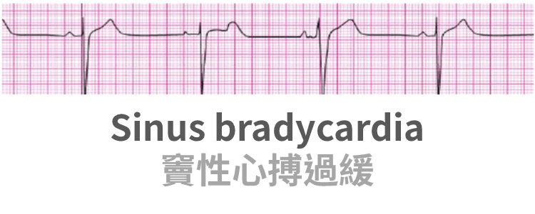 • Sinus bradycardia 特徵:規律的 P 之後跟著 QRS,且 PR < 0.2 秒