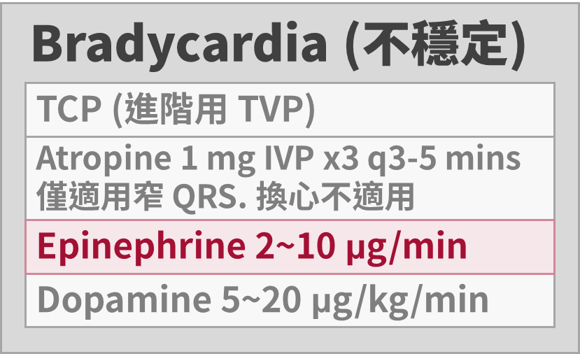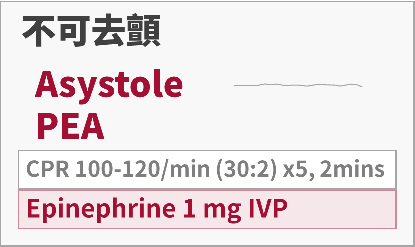 • 無脈搏:PEA 流程(這時不叫 sinus bradycardia,而是 PEA)
